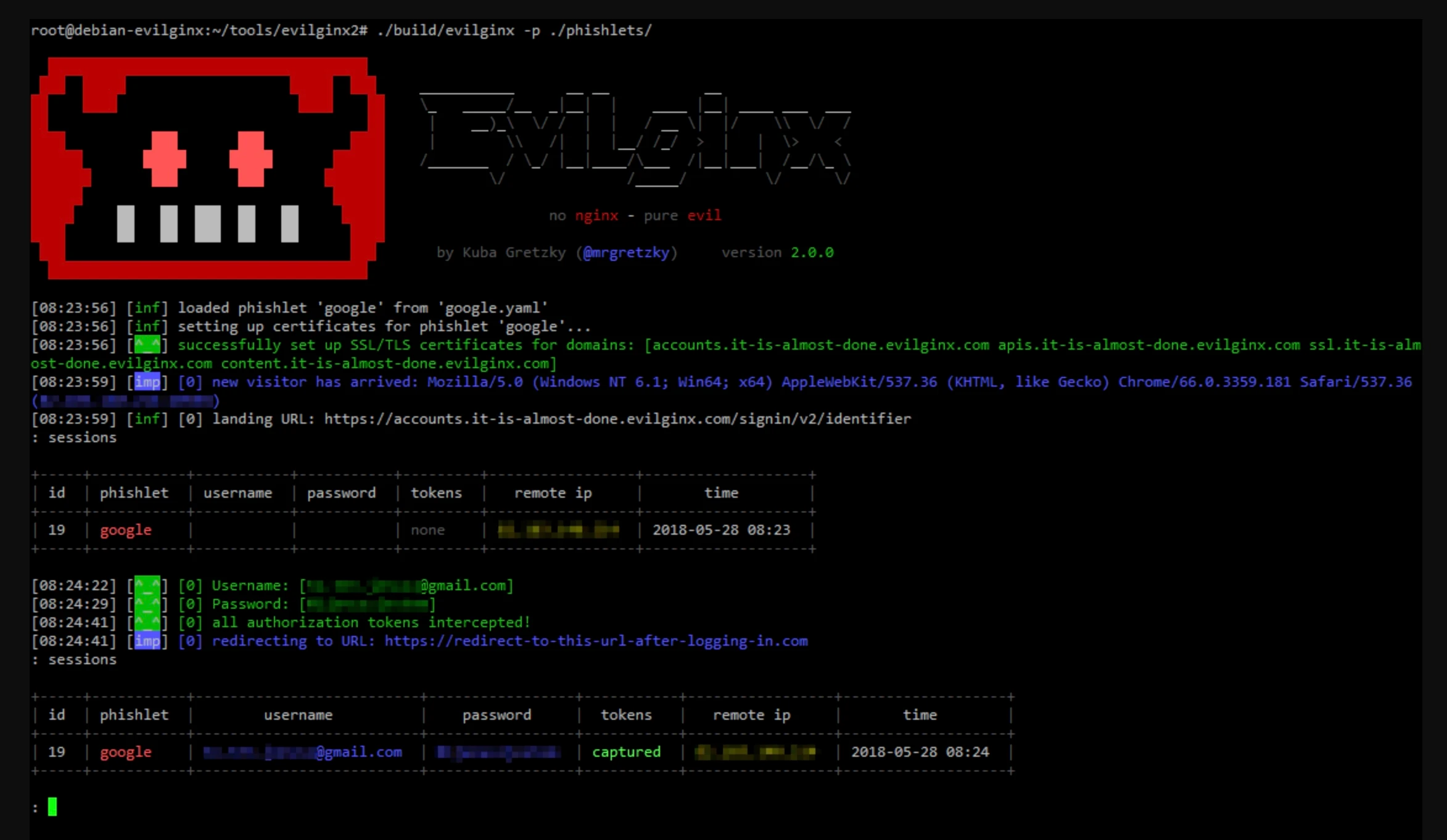 An image showing Evinginx2 phishing kits capturing login credentials during a mock phishing attack. (Source: Evilginx via GitHub).